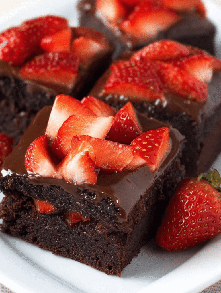 Chocolate Covered Strawberry Brownies combine the rich, fudgy texture of brownies with the sweet and tart flavor of fresh strawberries, all topped with a luscious chocolate ganache. This decadent dessert is perfect for special occasions or as a delightful treat for chocolate lovers.