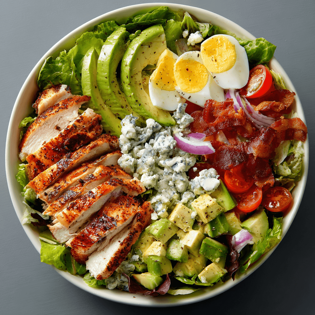 Cobb Salad is a classic American salad that combines fresh greens with a variety of toppings, including grilled chicken, crispy bacon, hard-boiled eggs, avocado, and blue cheese. This hearty salad is not only delicious but also packed with protein, making it a perfect meal for lunch or dinner.