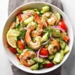 - Mix Salad Ingredients: In a large bowl, combine the cooked shrimp, diced cucumbers, halved cherry tomatoes, chopped red onion, and fresh dill.