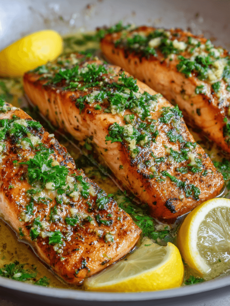 - Serve: Plate the salmon and drizzle with the garlic butter sauce. Serve with lemon wedges on the side.
