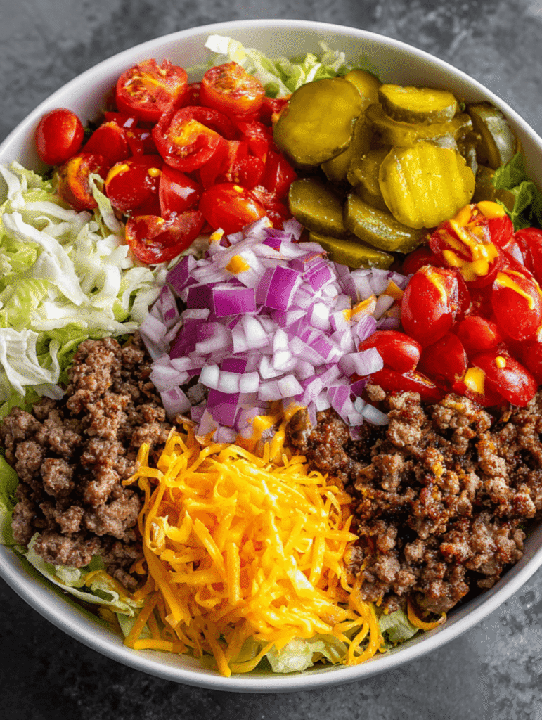 2. Add Toppings: Divide the cooked ground beef among the bowls. Top each bowl with cherry tomatoes, pickles, shredded cheese, and sliced red onion.