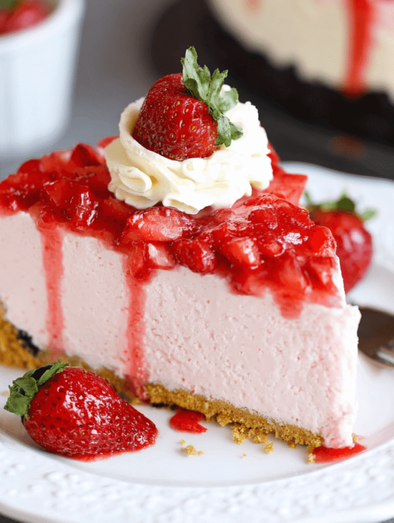 No-Bake Strawberry Cheesecake is a creamy, delicious dessert that combines a rich cheesecake filling with fresh strawberries, all on a buttery graham cracker crust. This easy-to-make dessert is perfect for warm weather gatherings and requires no baking!