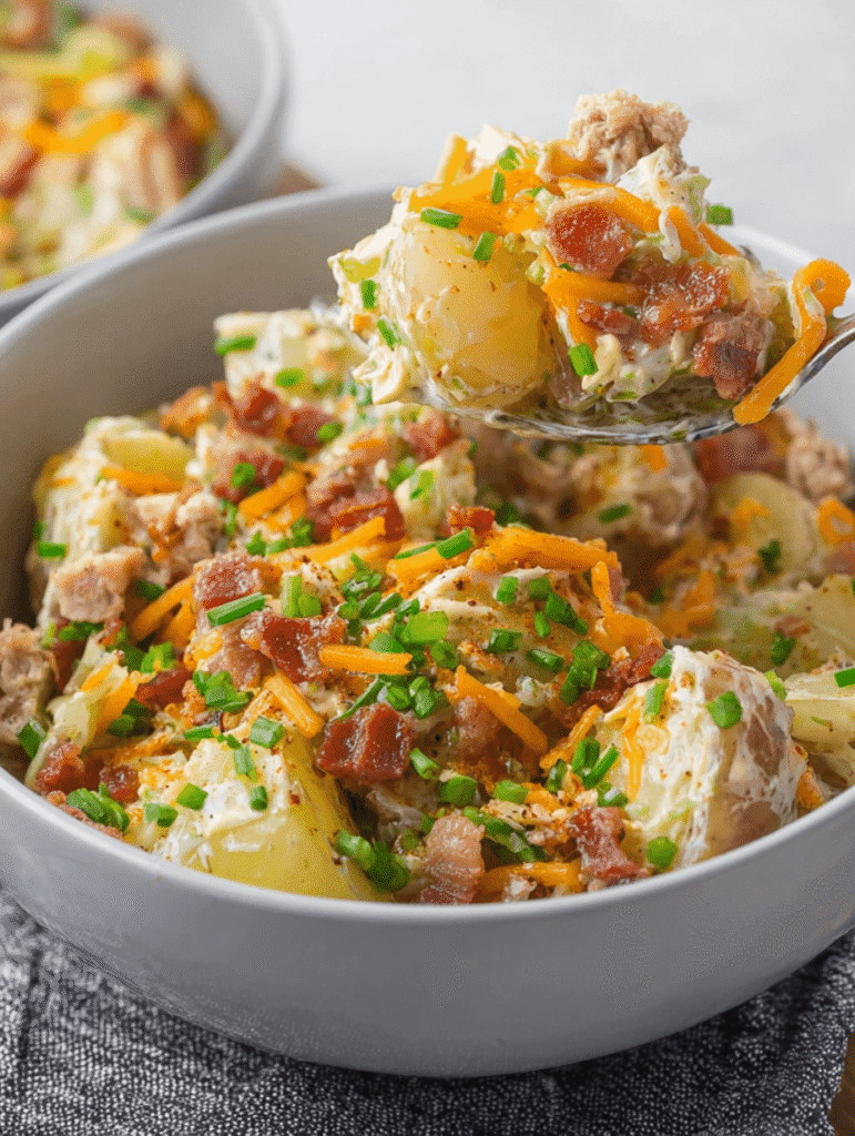 - Add Potatoes and Bacon: Once the potatoes are cool enough to handle, cut them into bite-sized pieces and add them to the dressing. Gently fold in the crumbled bacon and shredded cheddar cheese (if using).