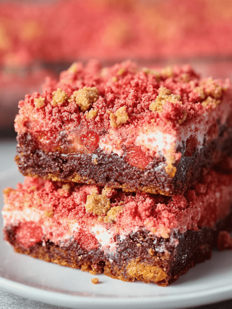 - Add Strawberry Crunch: Sprinkle the strawberry crunch topping over the cream cheese layer or directly onto the cooled brownies if not using cream cheese.