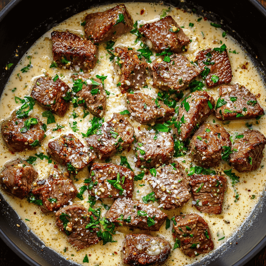 Tender Garlic Butter Steak Bites in a Rich Parmesan Cream Sauce Recipe